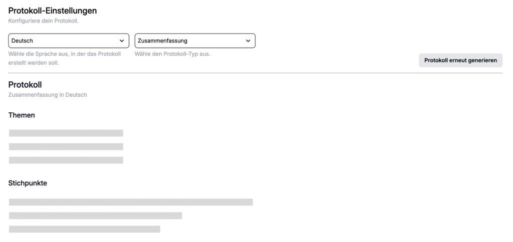Automatisierte Protokolle: Zusammenfassung, strukturierte Niederschrift oder individuelle Protokollstruktur auf Anfrage.
