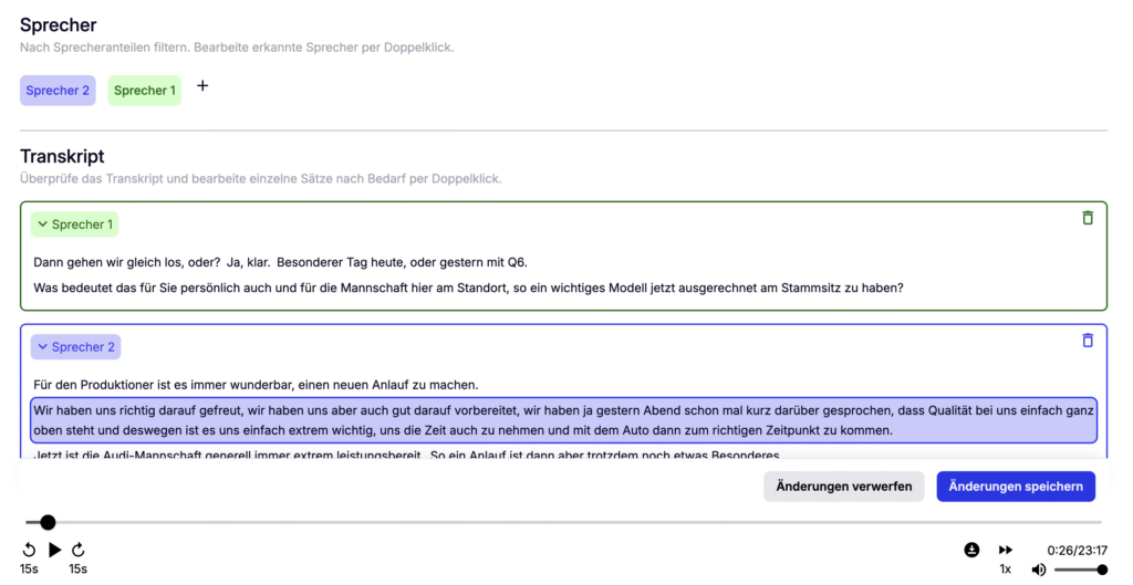 Sprecher können umbenannt und gefiltert, Textabschnitte angepasst oder gelöscht werden.